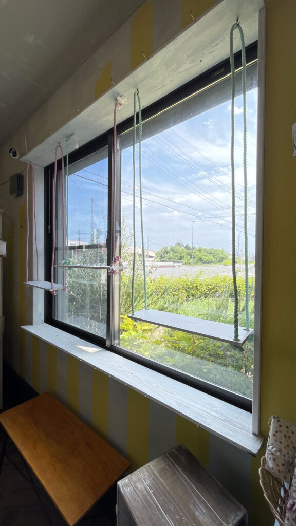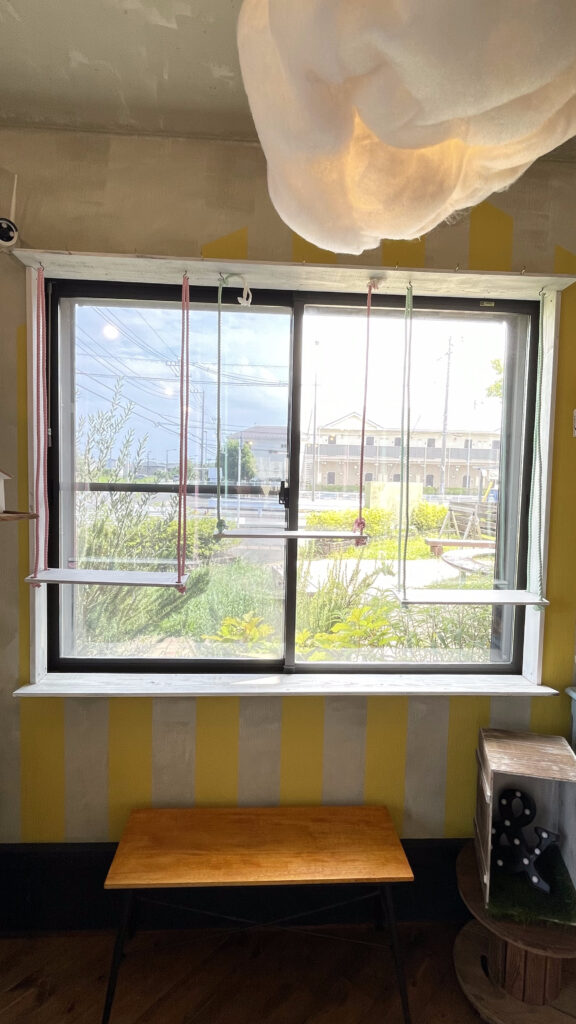 窓枠上部にフック7本、ブランコは撤去可能です。