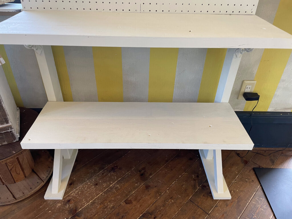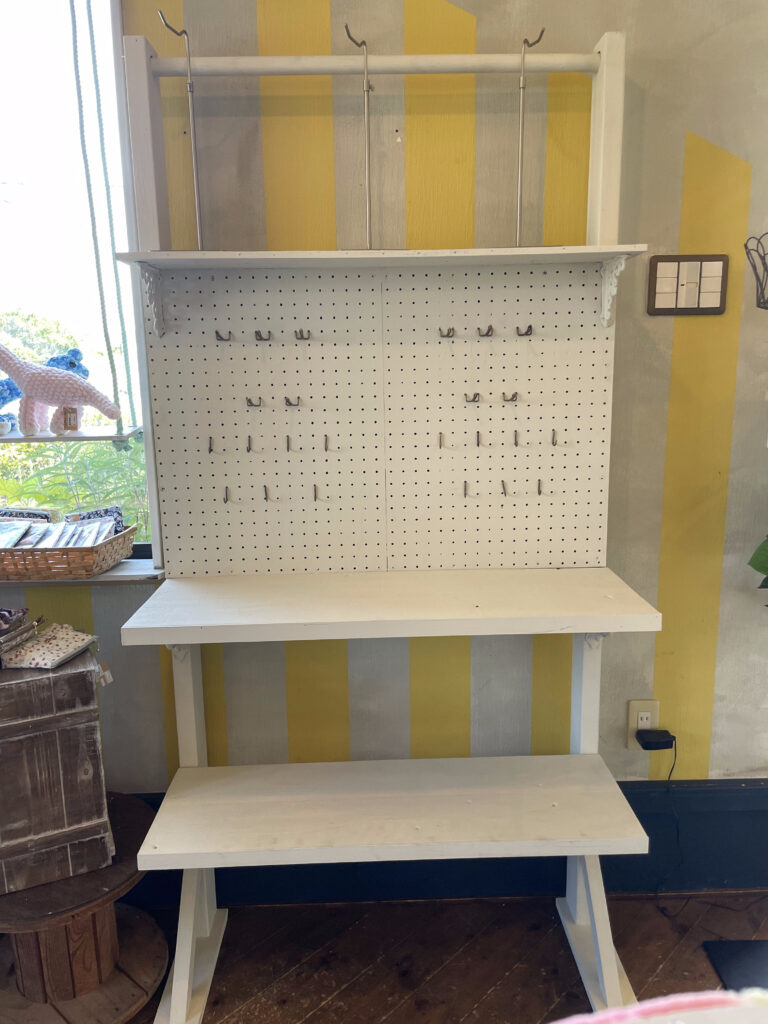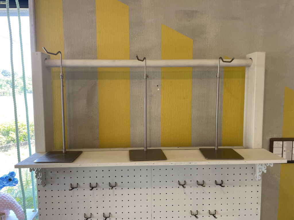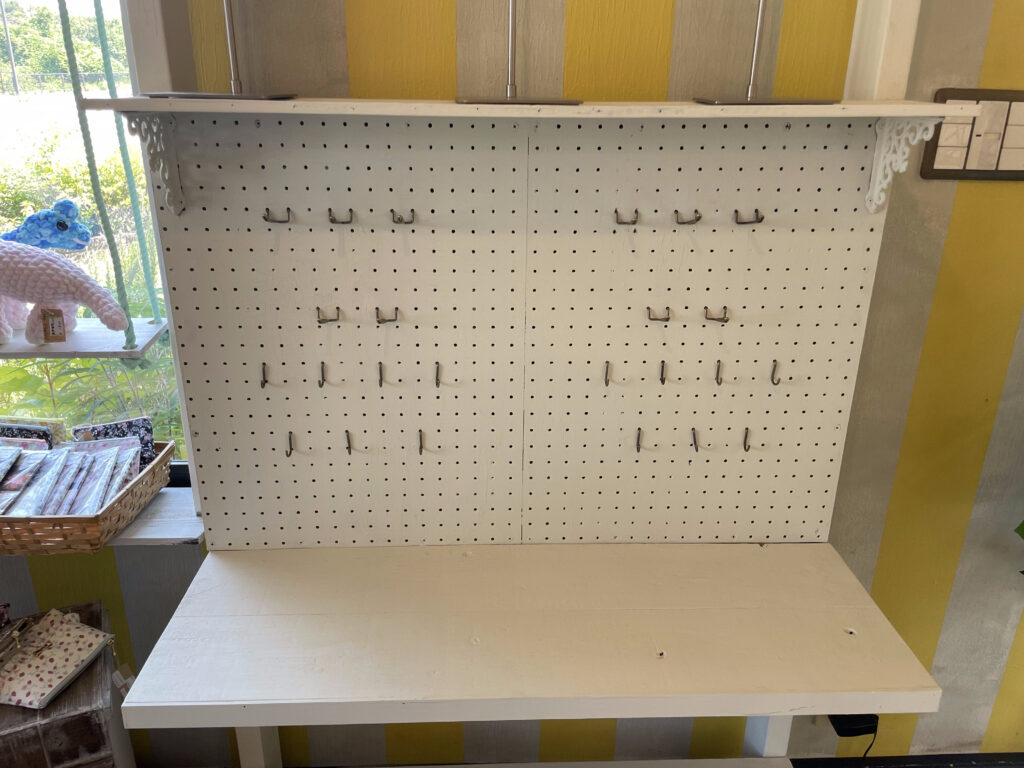 上段、中段(左・右)、下段があり、中段はパンチングボードにフックが付けられるため、自由度の高いスペースになります。上段は高さのある作品(バッグ等)に向いてます。